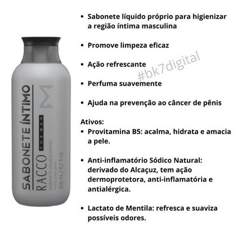 O Sabonete Íntimo Masculino Racco For Men é próprio para higienizar a região íntima masculina. Possui ativos que acalmam, hidratam e amaciam a pele, além de ação ação dermoprotetora, sem deixar de lado a função de refrescar e suavizar possíveis odores. Com um otimo perfume.